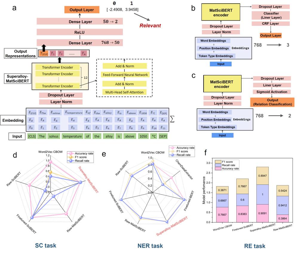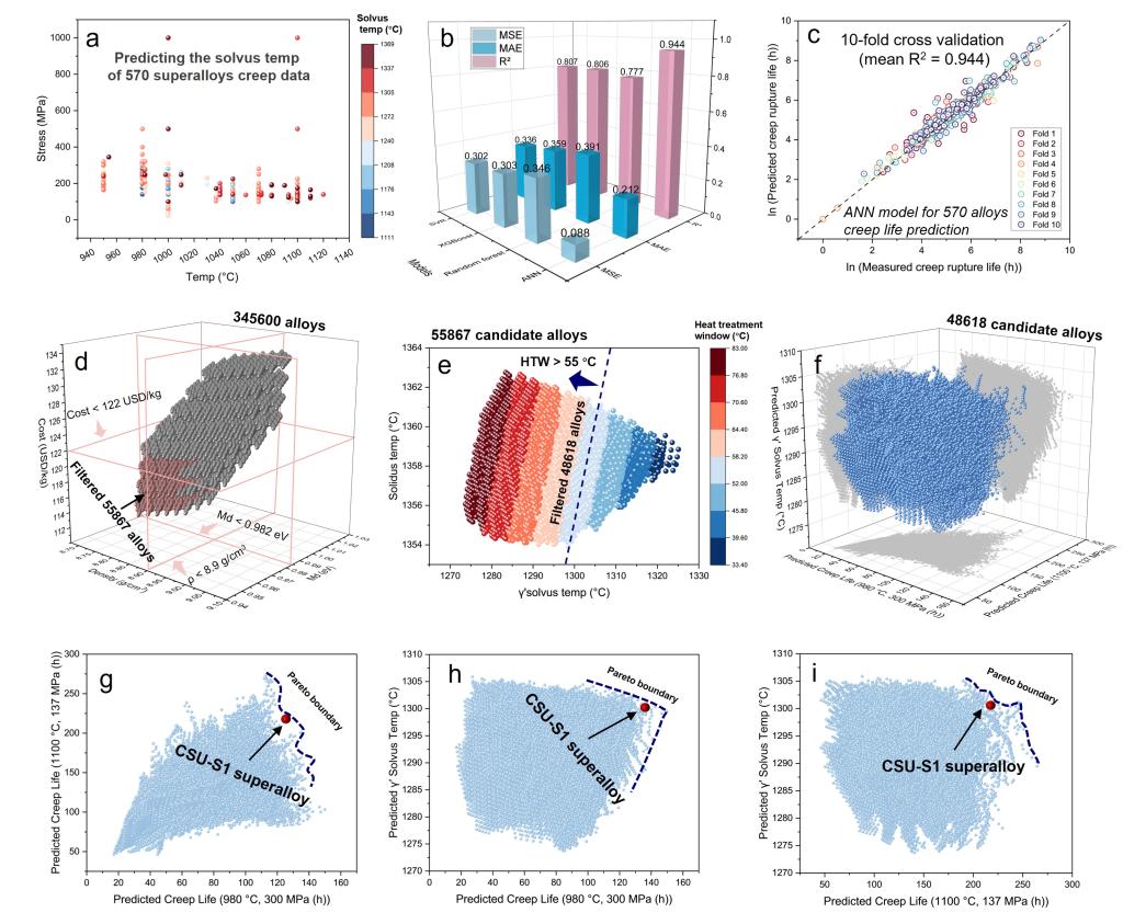 该研究首先开发了名为“Superalloy-MatSciBERT”的领域专用自然语言处理(NLP)模型,成功从超过五万份科研文献和专利中自动、精准地提取出135个高质量的γ′相溶解温度实验数据,构建了结构化的高保真数据库。在此基础上,团队训练了高精度的机器学习(ML)模型,能够准确预测新合金成分的γ′相溶解温度和蠕变寿命。依托这一强大的“AI大脑”,研究人员对345600种虚拟镍基合金成分进行了高通量筛选,并综合考虑成本、密度、组织稳定性及工艺窗口等多重工程约束,成功设计出一种新型低成本高性能合金——CSU-S1。