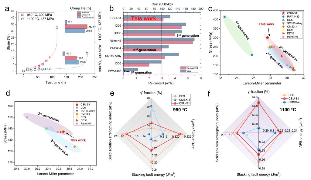 实验验证表明,CSU-S1合金的γ′相溶解温度高达1298.2°C,在1100°C/137MPa条件下的蠕变寿命达到224.7小时,其综合性能媲美昂贵的第三代单晶高温合金。尤为突出的是,该合金的铼(Re)含量仅为3.1 wt%,材料成本低至121美元/公斤,显著优于同类产品。这项工作不仅设计了一款极具应用前景的新材料,更重要的是,建立了一套可推广的智能化材料研发通用框架,为加速先进工程材料的创新开辟了全新路径。