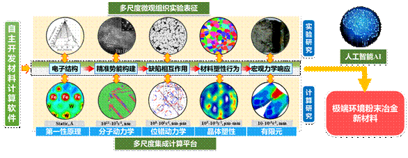 In view of the complex extreme environments such as high temperature, high pressure, high strain and high salt faced by aerospace metal structural materials during their service process, multi-scale computational methods such as crystal plasticity finite element, phase field simulation, molecular dynamics, phase diagram calculation, etc., combined with deep learning, are used to conduct in-depth research on the multi-scale organizational evolution mechanism of metal structural materials such as high-strength aluminum alloys and tungsten alloys for aerospace in extreme environments, as well as their behaviors such as electrochemical corrosion, mechanical deformation and damage failure.