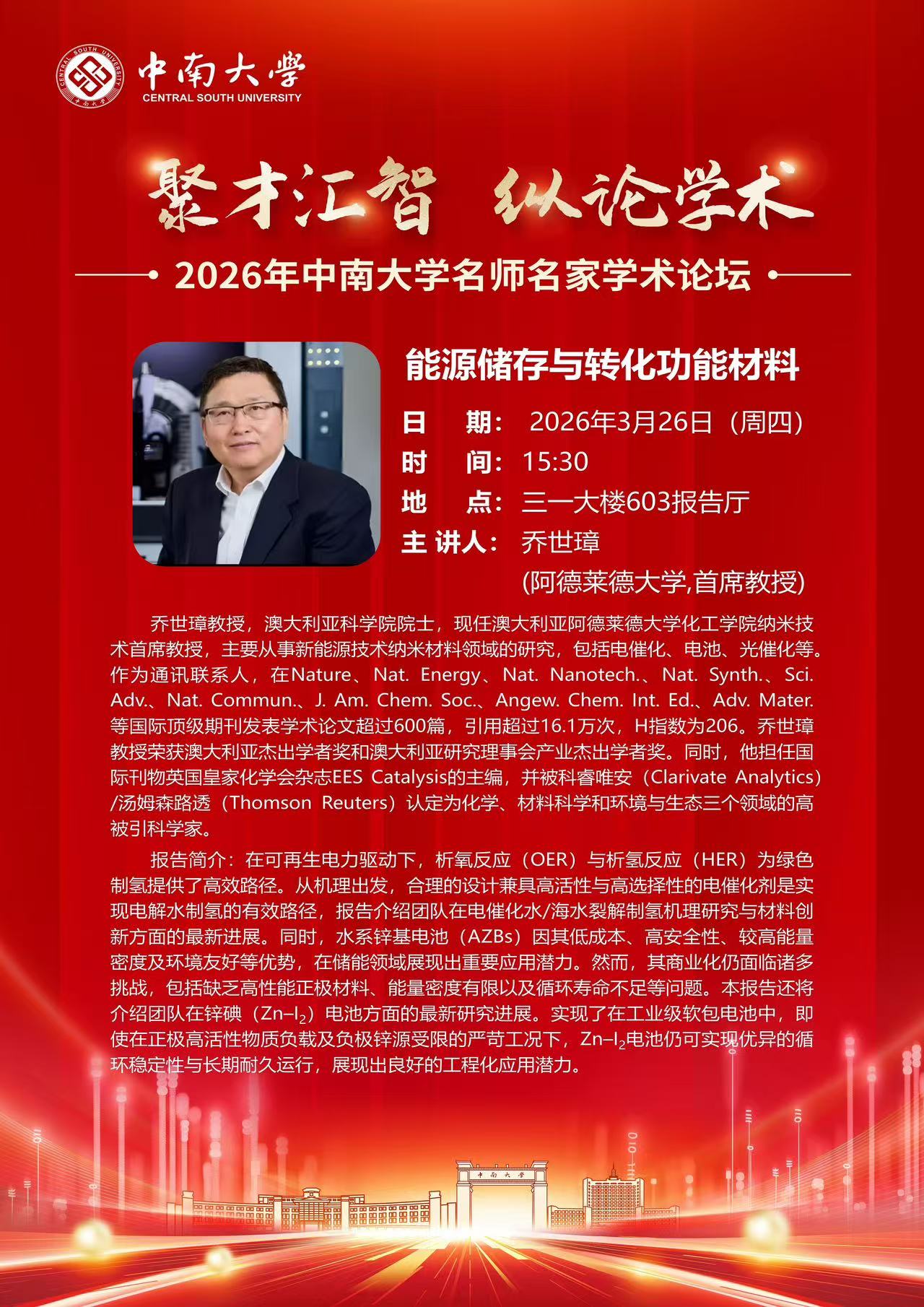 2026年必赢亚洲 名师名家学术论坛——乔世璋(能源储存与转化功能材料)