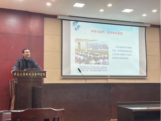 首先,王书记讲述了科学家精神及其内涵。他指出,“科学没有国界,但科学家是有祖国的,科学家精神是一种宝贵的精神财富”。接着,王书记通过列举科学家事迹、科学发现,并结合自身经历,让党员同志们真切地领略到科学家精神所蕴含的创新科技、服务国家、造福人民的家国情怀,深刻感受到科学家们深厚的学术造诣、宽广的科学视角、严谨求实的治学精髓。最后,王书记讲述了中国科学家精神及粉冶精神,强调新时代更需要继续发扬以国家民族命运为己任的爱国主义精神,以爱国主义为底色的科学家精神。
