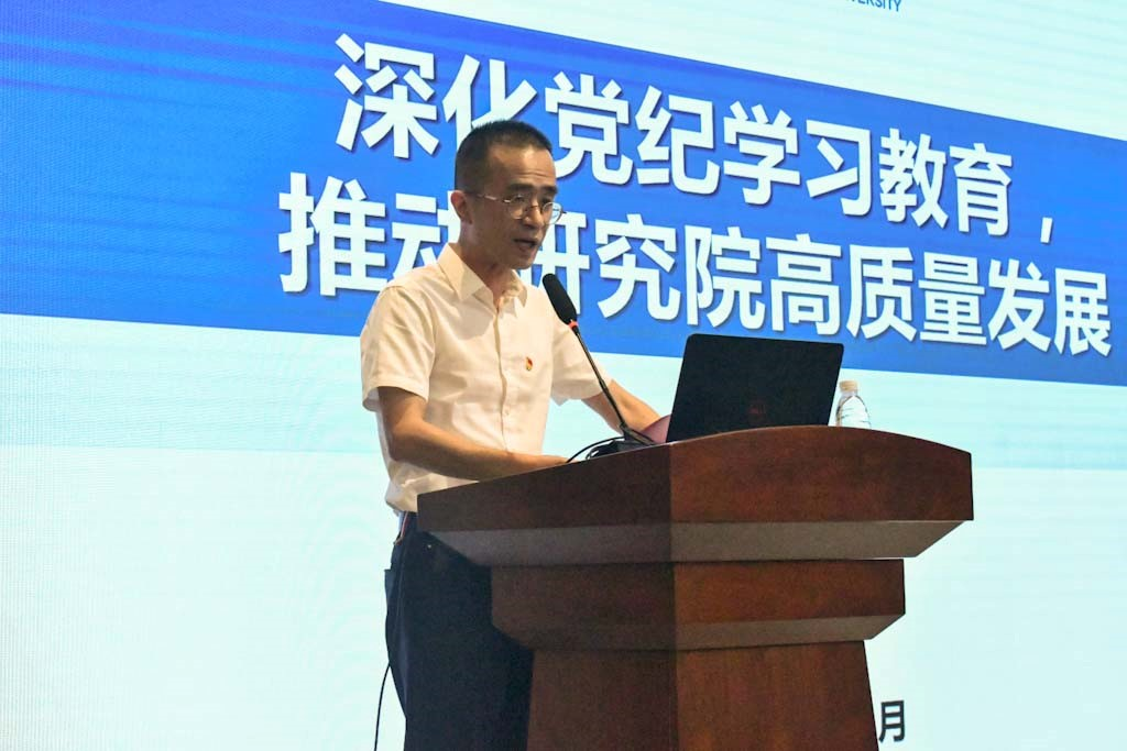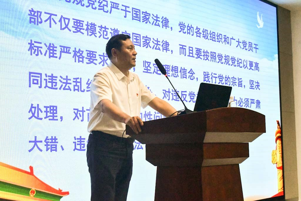 随后,院党委书记王德志就党的纪律的内涵、特点与作用,《中国共产党纪律处分条例》解读,加强纪律建设、推动高质量发展三个方面开始本次党课主要内容的讲授。授课过程中,王德志书记强调了党规党纪于党员的约束性和重要性,并以多个负面案例说明党员绝不可逾越党纪的红线。同时,他也对《中国共产党纪律处分条例》作出了自己的解读,提醒所有到课的党员遵守党规党纪。