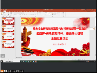 清明节是中华民族的传统节日,在这一天人们通过各种方式缅怀先人,寄托哀思。鉴于当前疫情防控形势,为坚决阻断疫情传播风险,避免传统现场祭扫引发人员大规模流动聚集,传承弘扬英烈事迹和精神,在疫情防控的特殊时期,粉冶院高温结构材料研究所第一党支部于4月5日晚7点,通过腾讯会议平台,举行了主题为“云缅怀·传承英烈精神,奋进伟大征程”的线上主题党日活动,旨在缅怀在保家卫国、抢险救灾、抗击疫情等战线上为祖国和人民献出宝贵生命的忠魂英烈,在纪念、追思、致敬中汲取奋进力量。