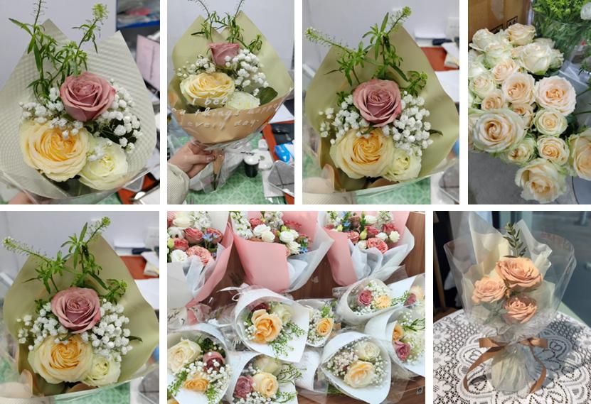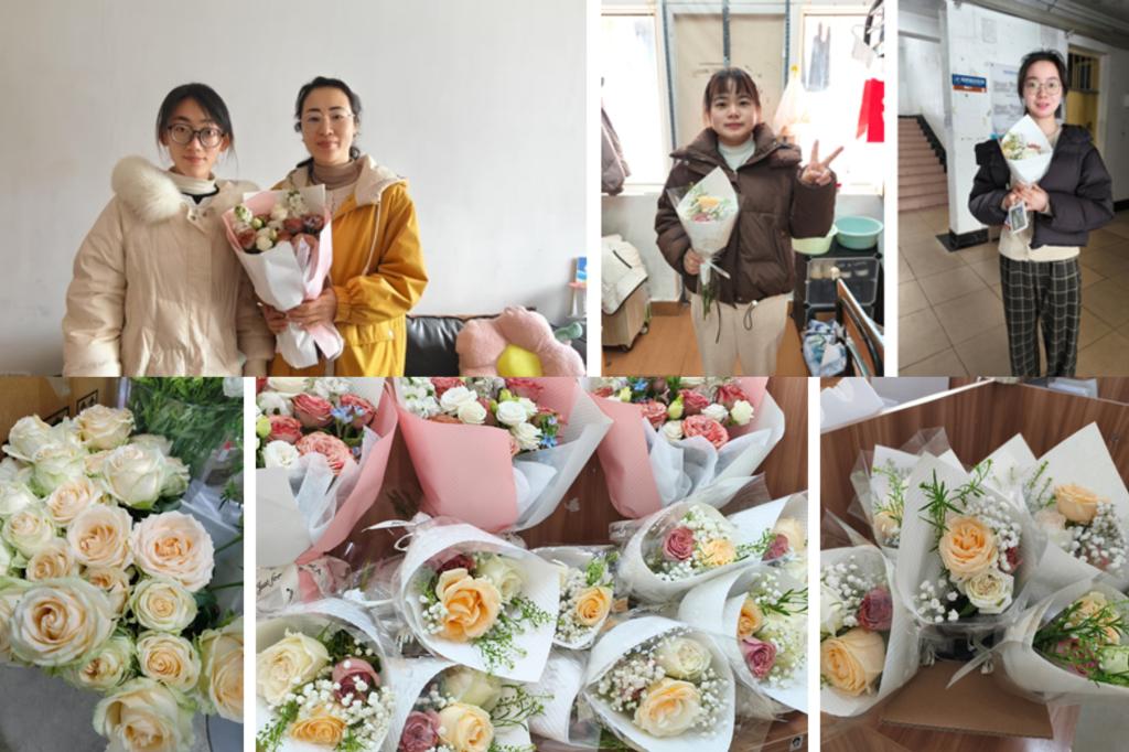 为确保活动顺利开展,党支部提前两周进入筹备阶段,并特别选取了象征优雅与坚韧的卡布奇诺玫瑰,搭配满天星作为配花,寓意“平凡中绽放非凡”。花束以浅粉与白色为主色调,既呼应节日的温馨氛围,又凸显女性的柔美与力量。