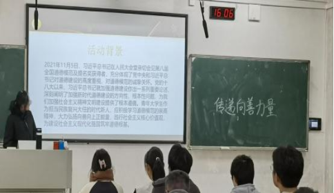 活动开始第一项,各班团支书一同对本次主题团日进行说明并引出主题,随机抽取同学进行问答活动,进一步活跃了活动气氛,让同学们对于接下来的活动更加期待。