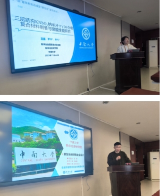 刘媛作题为“三层结构KNbO3纳米片/PVDF介电复合材料制备与储能性能研究”的学术报告。她在报告中从研究方向的背景、基体选择、填料选择、复合材料制备流程、物相分析、性能测试等方面,对研究内容进行详细的阐述。