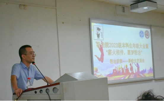 活动开始,黄曦老师对材料专业的发展前景进行了解读。他提及材料行业十几年的行业发展状况,并表示材料专业是一个具有广阔发展前景的行业。同时,他介绍了粉冶院优秀的师资队伍与科研团队、丰富多彩的学生活动以及粉冶院在“互联网+”等各类赛事方面取得的佳绩,以此来增进新生对大学学习生活的向往与憧憬。