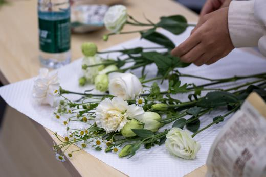 最后,在花艺社四位成员的协助下,同学们纷纷拿起剪刀和花束,运用刚刚所学的知识,完成选花、配花、剪花、饰花等环节,创作出了属于自己的独一无二的插花。
