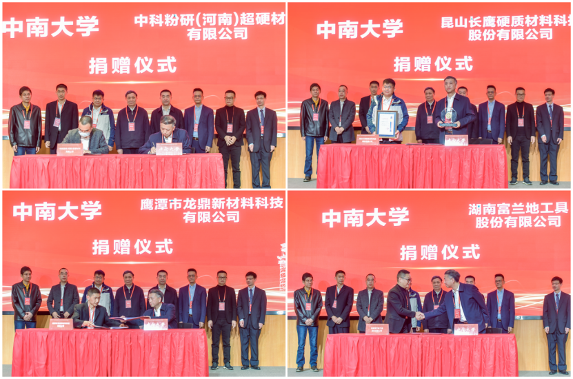 会上宣读了“黄伯云教育发展基金”倡议书并举行基金捐赠仪式。中科粉研(河南)超硬材料有限公司捐赠200万元、昆山长鹰硬质材料科技股份有限公司捐赠100万元、鹰潭市龙鼎新材料科技有限公司捐赠100万元、湖南富兰地工具股份有限公司捐赠100万元,山西三元炭素有限责任公司捐赠30万元。此前,湖南金博股份有限公司已向基金捐赠2千万元。此外,各界校友也纷纷通过线上捐赠渠道为“黄伯云教育发展基金”设立贡献力量。