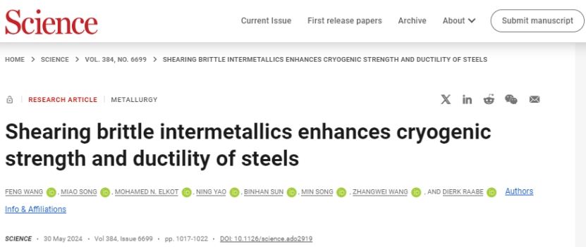 粉末冶金国家重点实验室王章维教授和宋旼教授合作,在国际学术期刊《Science》上在线发表了题为“Shearing brittle intermetallics enhances cryogenic strength and ductility of steels”的研究论文,中文题目为“剪切脆性金属间化合物提高钢的低温强度和塑性”。必赢亚洲