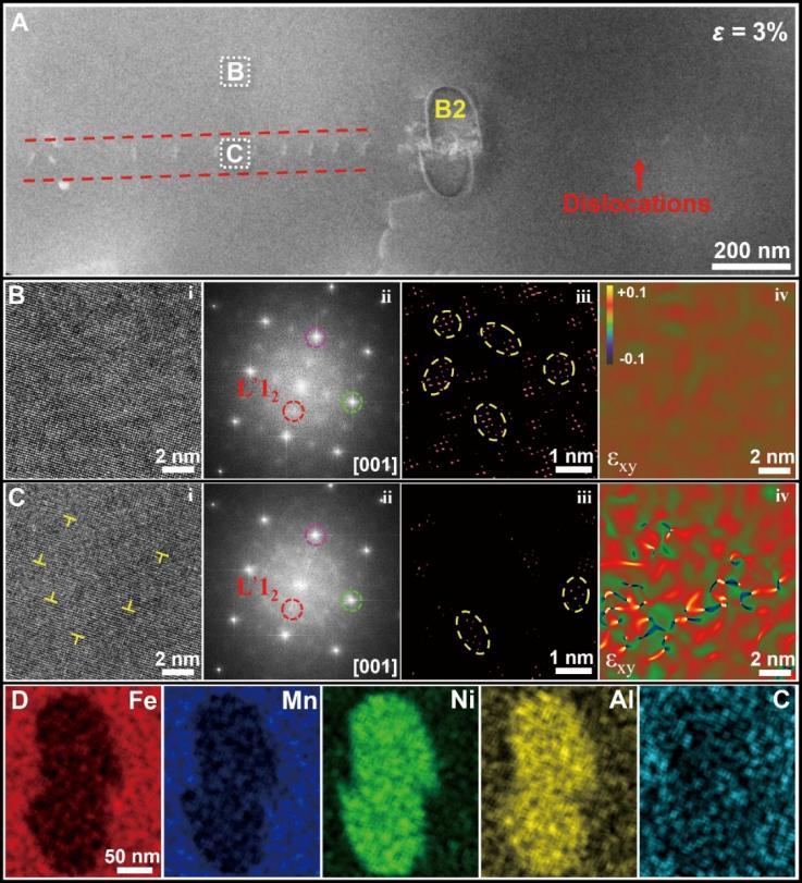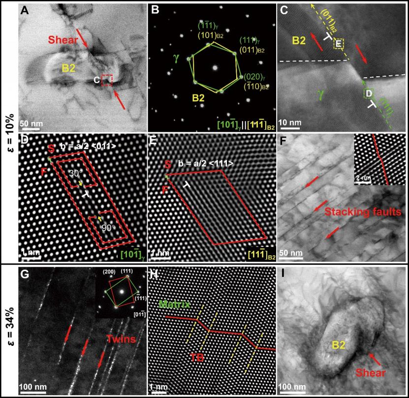 研究发现,高熵钢在塑性变形过程中平面滑移的位错能够切过硬脆的B2相颗粒,这主要是通过局部化学有序(LCO)结构和固溶强化引起的超高晶格摩擦应力来实现的。随着应变的增加,层错、孪晶等变形机制被激活,增强了加工硬化能力,从而进一步提高了位错剪切B2相颗粒的比例。B2相颗粒的剪切变形有效地缓解了奥氏体与B2颗粒异质界面处的应力集中,抑制了裂纹的萌生。