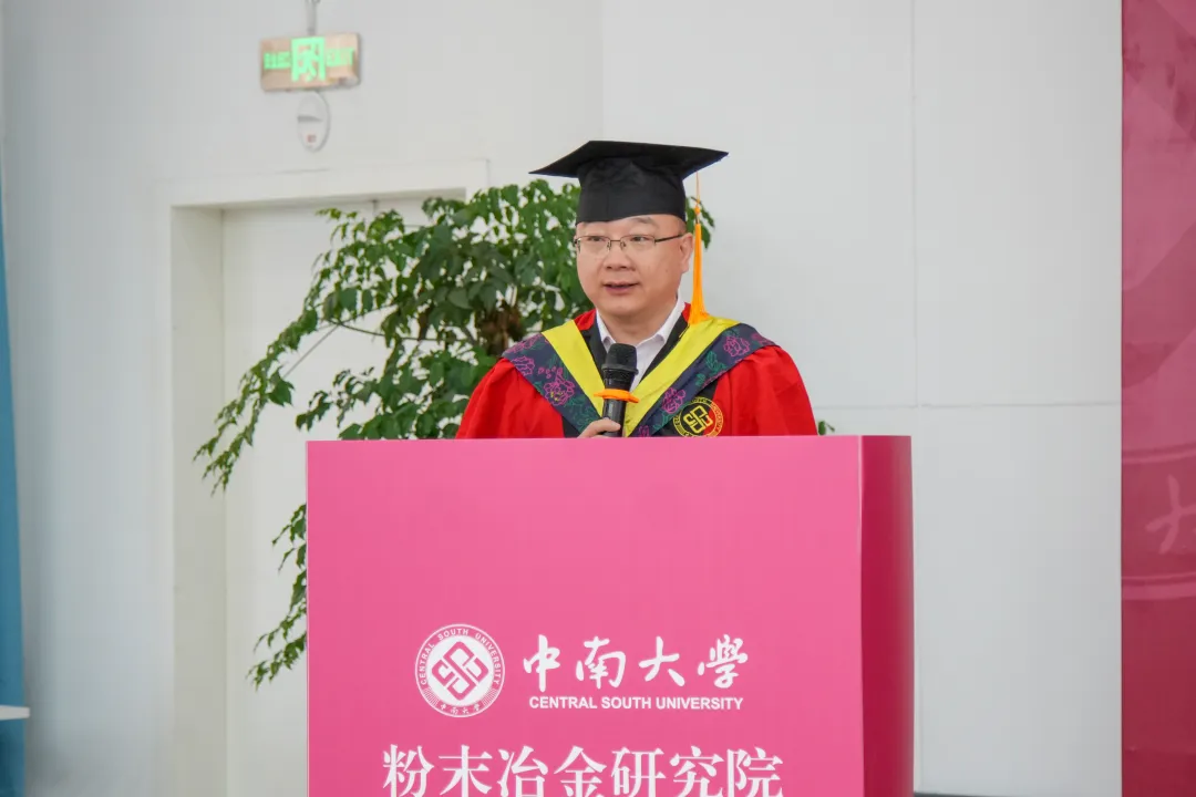 典礼接近尾声,张斗院长为毕业生致辞。他对毕业学生表达了诚挚的祝贺与祝福,骄傲地讲述了学生入学以来粉冶院取得的发展与成就。“尔我偏偏俱少年,飞扬意气生云烟。”张院长满怀豪气地勉励,他亲切嘱托着,“希望大家捂热科研的‘冷板凳’”,以热爱抵岁月漫长,不惧未知,不忘初心。
