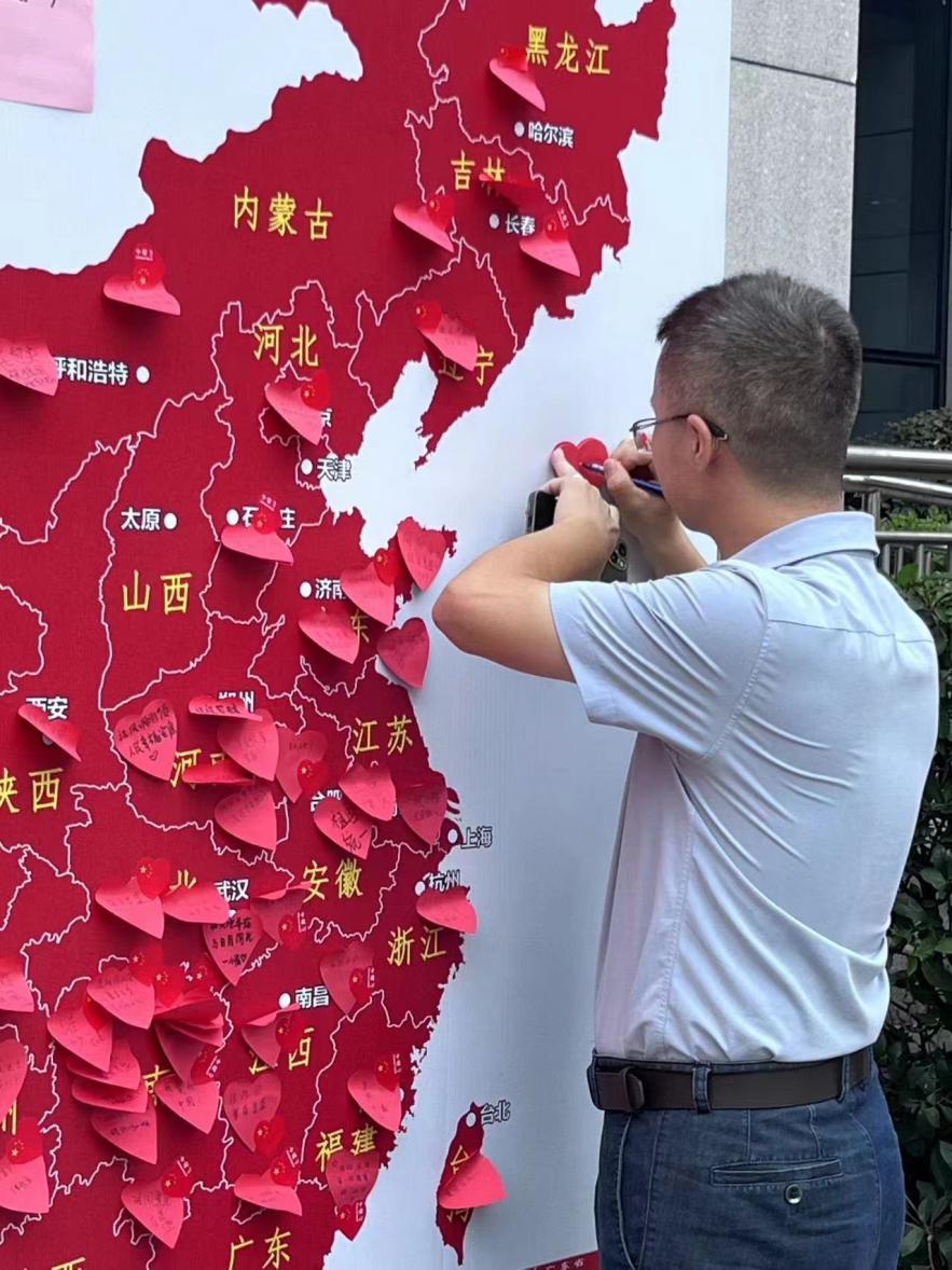 以“梦”告白,用“笔”献礼,大家用“青春告白祖国,书写强国梦想”的方式写下对祖国繁荣昌盛的美好祝愿,并将祝福语粘贴在地图上的家乡位置,向祖国告白,共同为祖国母亲庆生。