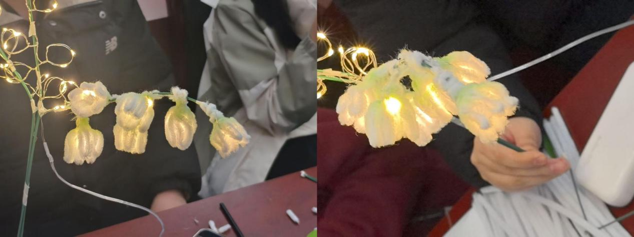 “折、扭、绕、捆、涂”,同学们按部就班,将每一步都细致入微地完成。制作过程中,大家既有自己的小巧思,将个人风格融入其中,又相互探讨、共同协作。同学们体验着将一根根扭扭棒变成一朵朵铃兰花,再将一个个小灯融入花艺,最终完成一盏独一无二的铃兰花灯的奇妙旅程。