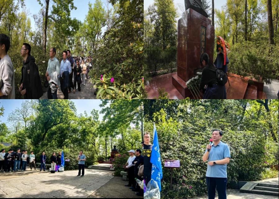 队伍抵达山腰的肖劲光铜像广场后,院党委书记王德志为我们带来了一堂沉浸式微党课。王德志书记讲述了肖劲光大将的生平事迹,强调了其勤俭朴素的高尚作风。随后全体同志列队肃立,向长眠的革命先烈默哀致敬,并依次献上菊花寄托哀思。活动最后,队伍继续攀登至山顶观景台,在俯瞰星城新貌中体悟时代使命。