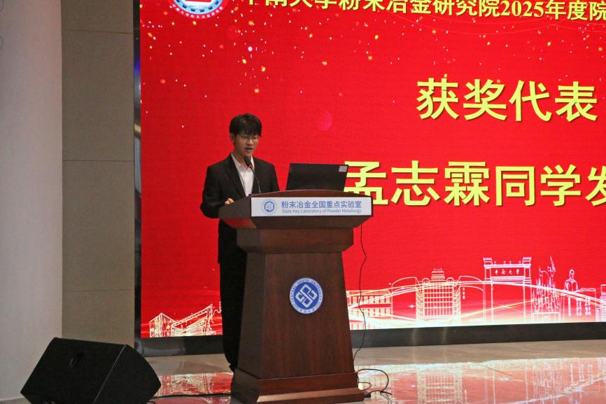 随后,2024级本科生孟志霖作为获奖学生代表上台发言,他向设奖企业与研究院致以诚挚感谢,表示这份奖励是对过去努力的肯定更是对未来前行的鼓舞。今后他将秉持严谨务实的态度,锤炼专业本领,把个人理想与国家需求紧密结合,努力成为一名不负时代、不负期待的新粉冶人。