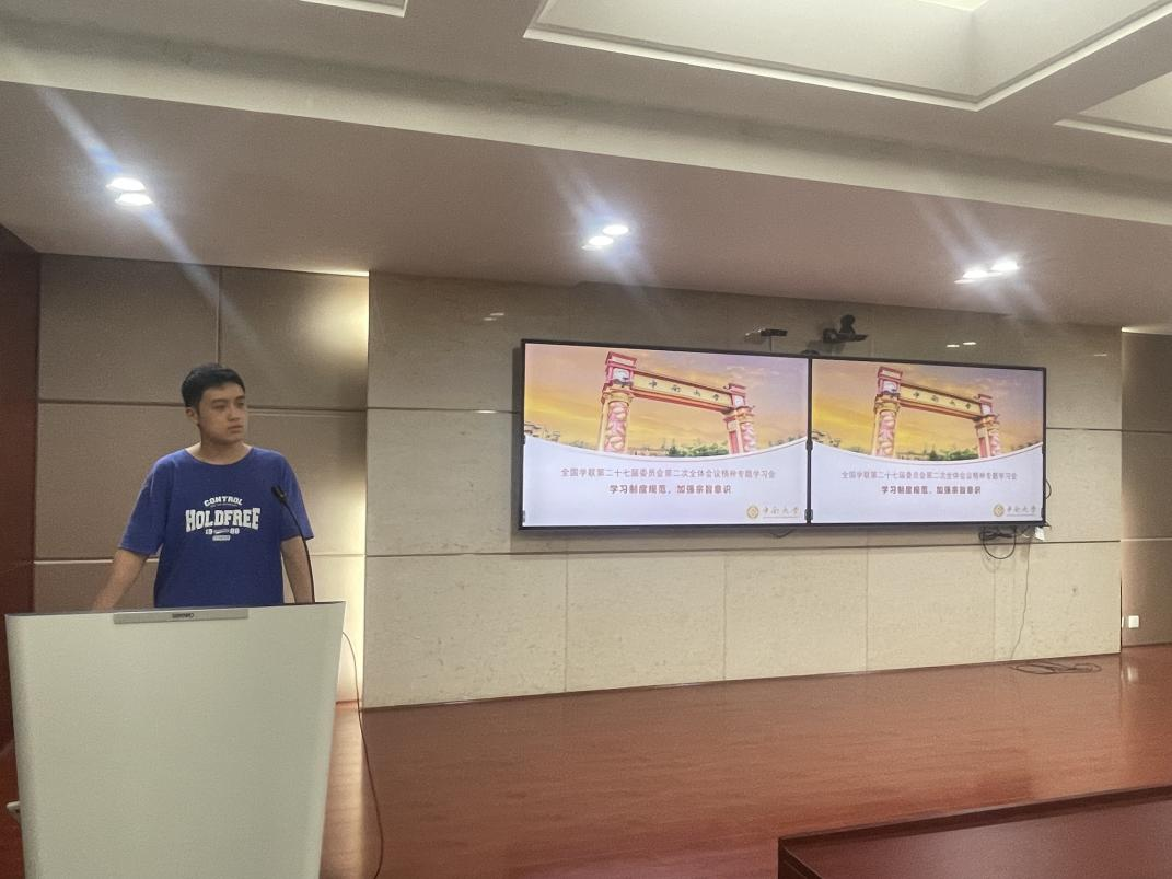 首先,冯开宇向同学们传达了《关于认真学习宣传贯彻党的二十大精神,团结带领广大同学坚定跟党走、奋进新征程的决议》《在全国学联第二十七届委员会第二次全体会议上的工作报告》《中华全国学生联合会委员会、主席团工作规则(试行)》等文件精神。