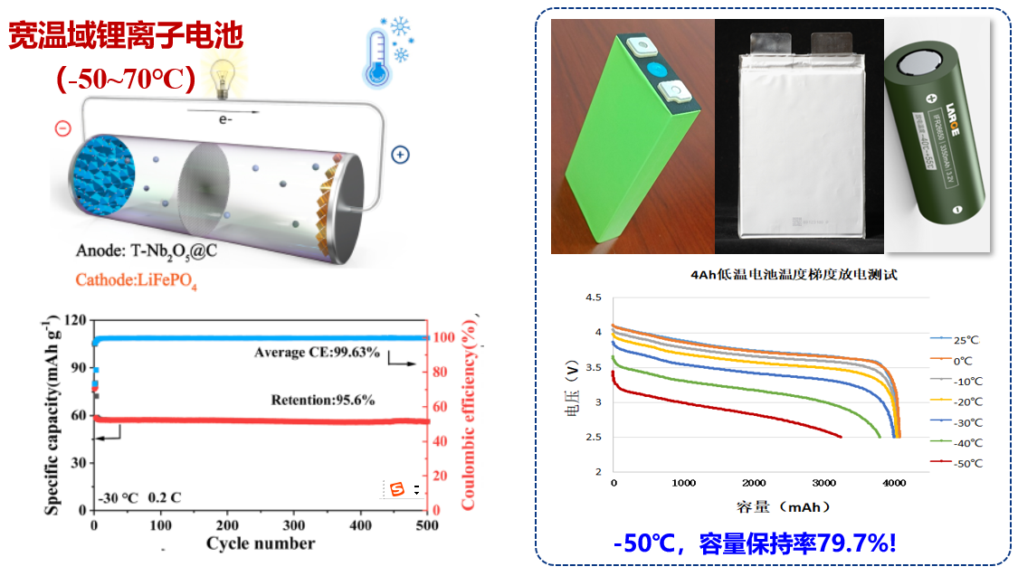 针对常规锂离子电池极限工作温度保持在-20℃~60℃范围,传统有机电解液存在易燃等安全隐患,难以满足极端条件应用要求。开发可同时兼顾高功率、阻燃和宽温域(-50℃~80℃)特种锂离子电池。