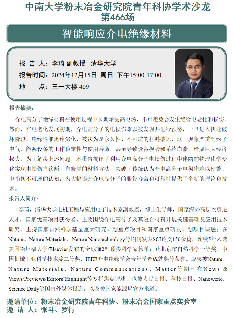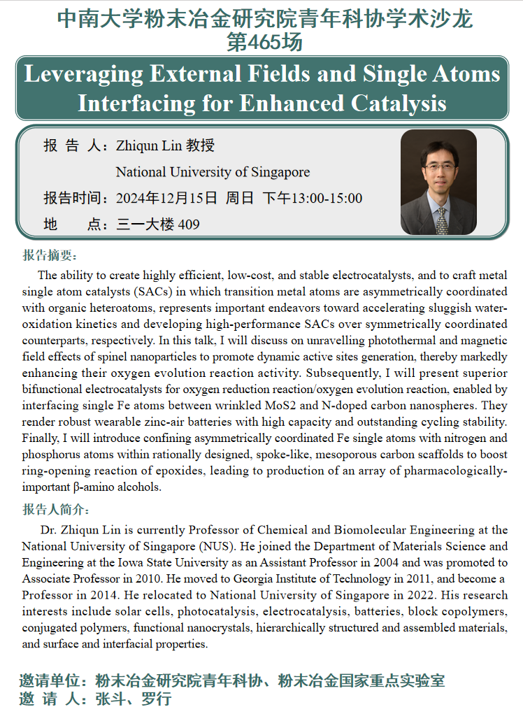 报 告 人:Zhiqun Lin 教授 National University of Singapore报告时间:2024年12月15日 周日 下午13:00-15:00地点:三一大楼 603报告摘要:The ability to create highly efficient, low-cost, and stable electrocatalysts, and to craft metalsingle atom catalysts (SACs) in which transition metal atoms are asymmetrically coordinatedwith organic heteroatoms, represents important endeavors toward accelerating slugg...